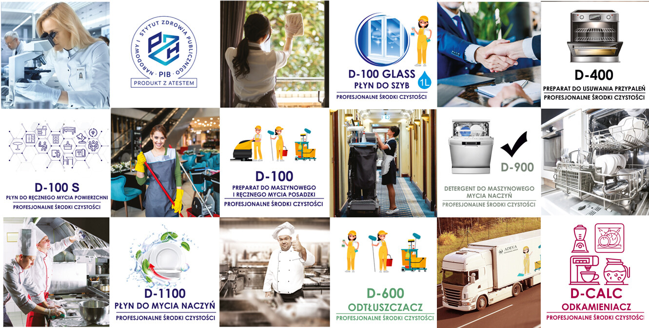 ADEVA PROFESSIONAL SERVICE produkuje profesjonalne środki czystości. Produkty dedykowane są dla hoteli, restauracji, sklepów wielkopowierzchniowych, firm sprzątających, szpitali, przychodni, szkół, przedszkoli, biurowców, aptek, drogerii, salonów samochodowych, galerii handlowych, hal targowych i innych. Nasze produkty cechuje bardzo wysoka jakość w przystępnej cenie. Nasza wiedza oraz doświadczenie mogą stać się dla podstawą do zwiększenia oszczędności.