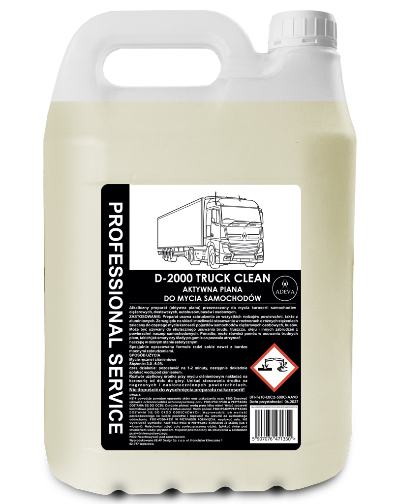 Alkaliczny preparat (aktywna piana) przeznaczony do mycia karoserii samochodów ciężarowych, dostawczych, autobusów, busów i osobowych. ZASTOSOWANIE: Preparat usuwa zabrudzenia ze wszystkich rodzajów powierzchni, także z aluminiowych. Ze względu na skład i możliwość stosowania w roztworach o różnych stężeniach zalecany do częstego mycia karoserii pojazdów samochodów ciężarowych osobowych, busów. Może być używany do skutecznego usuwania brudu, tłuszczu, oleju i innych zabrudzeń z powierzchni naczep samochodowych.